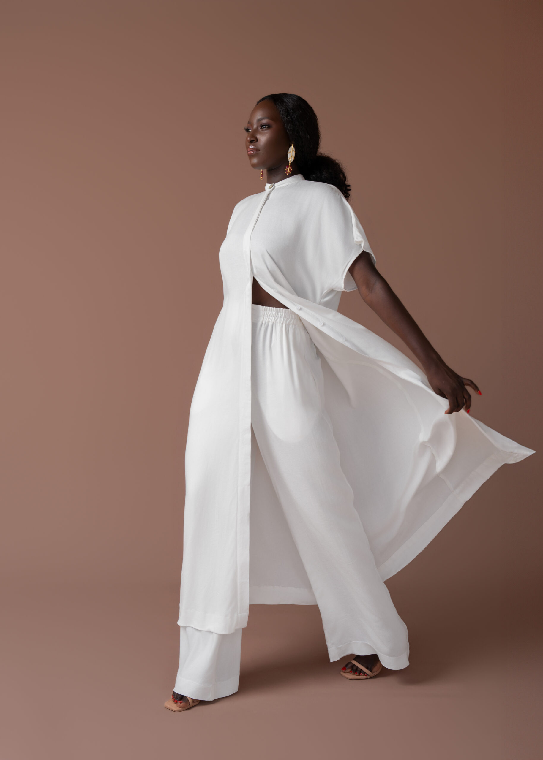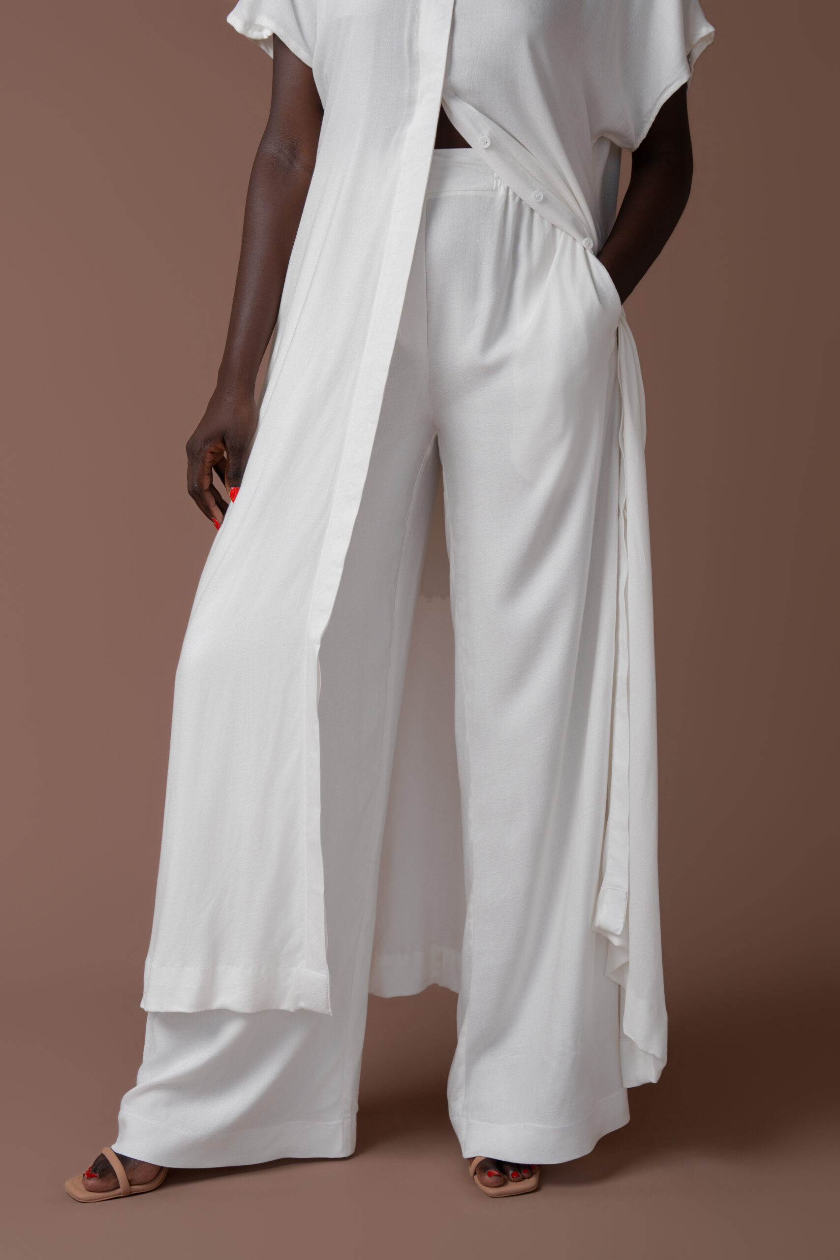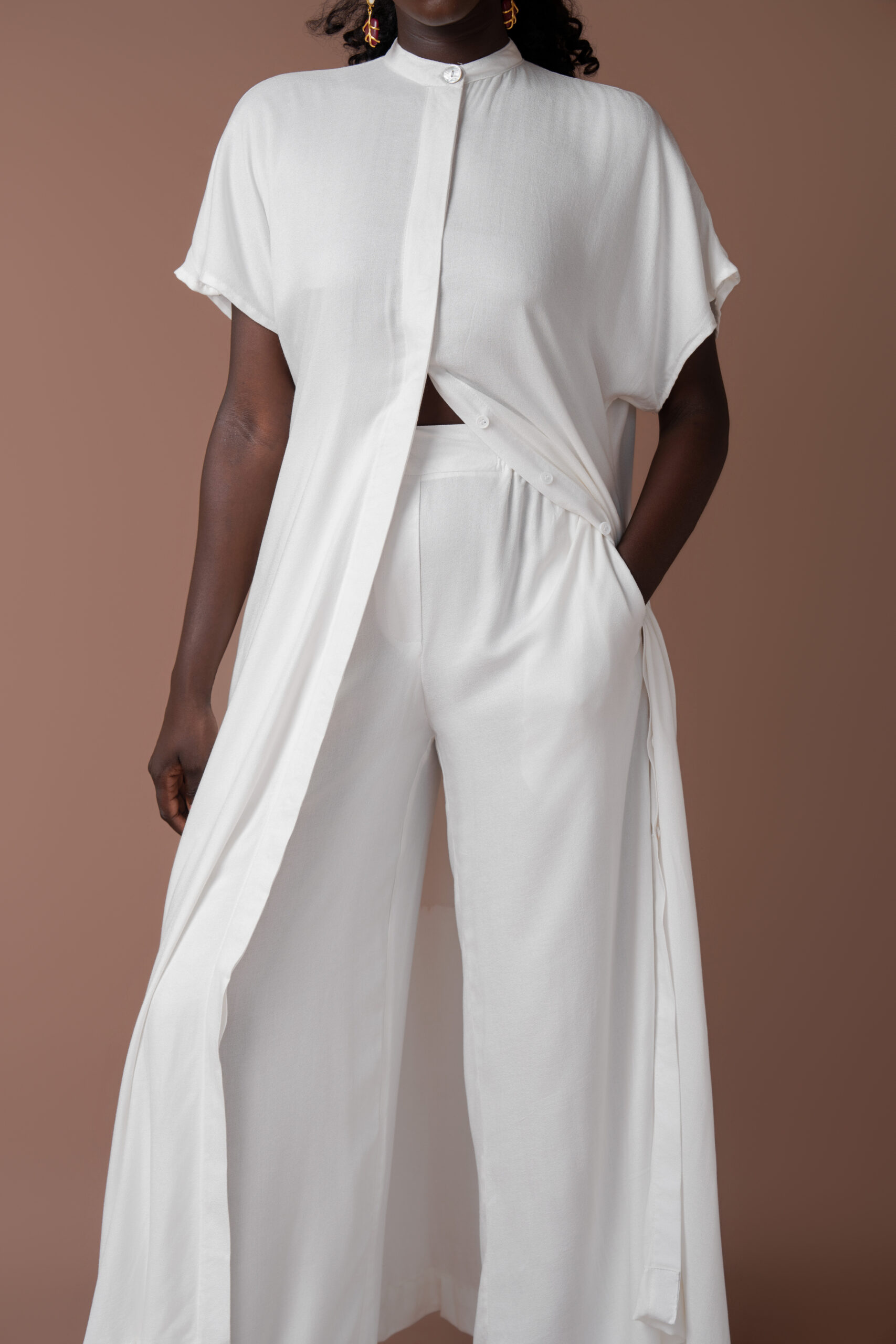 Ensemble ultra fluide en crêpe. Chemise longue à patte de boutonnage cachée. Pantalon avec ceinture élastique au dos pour plus de confort.