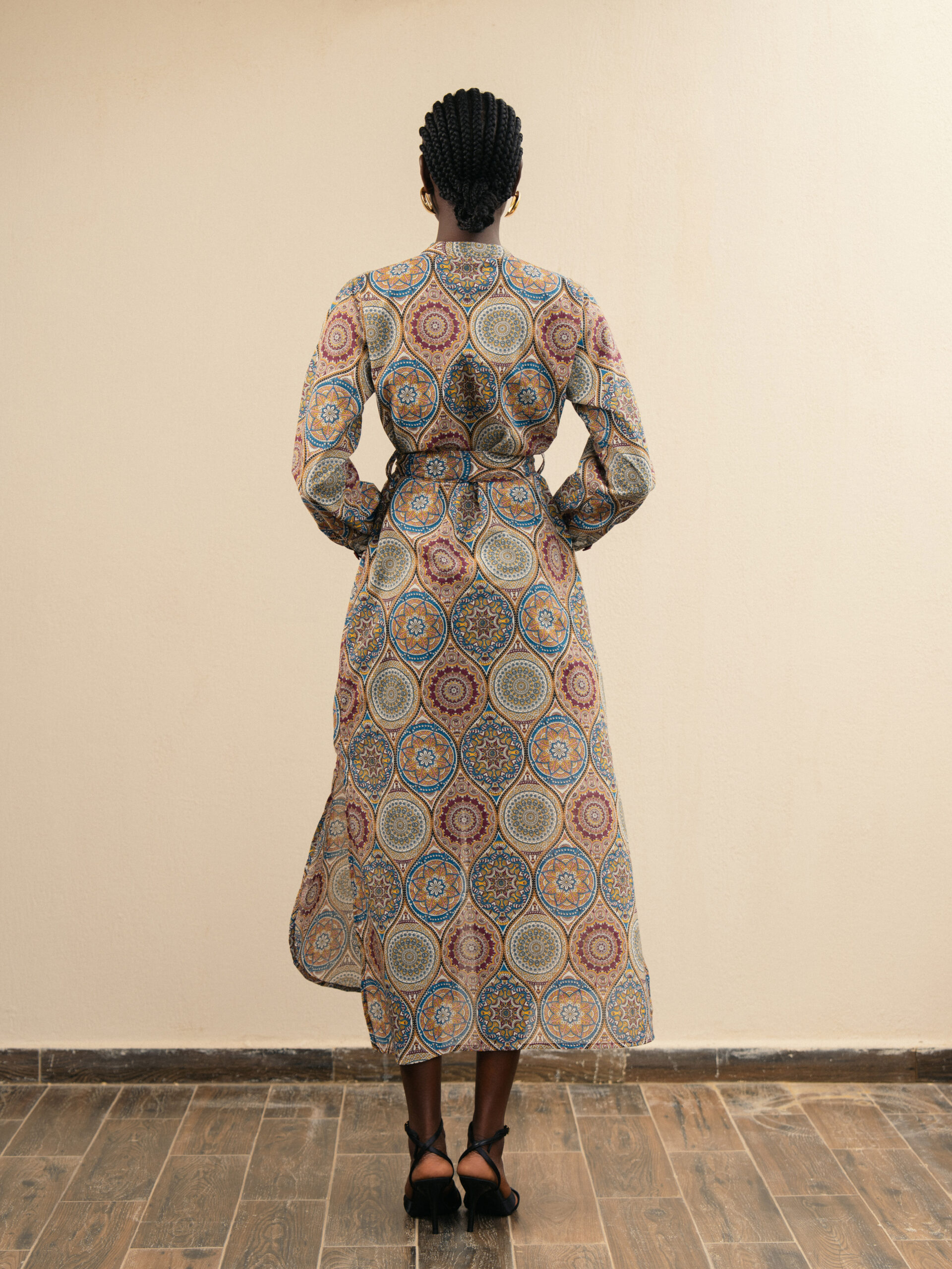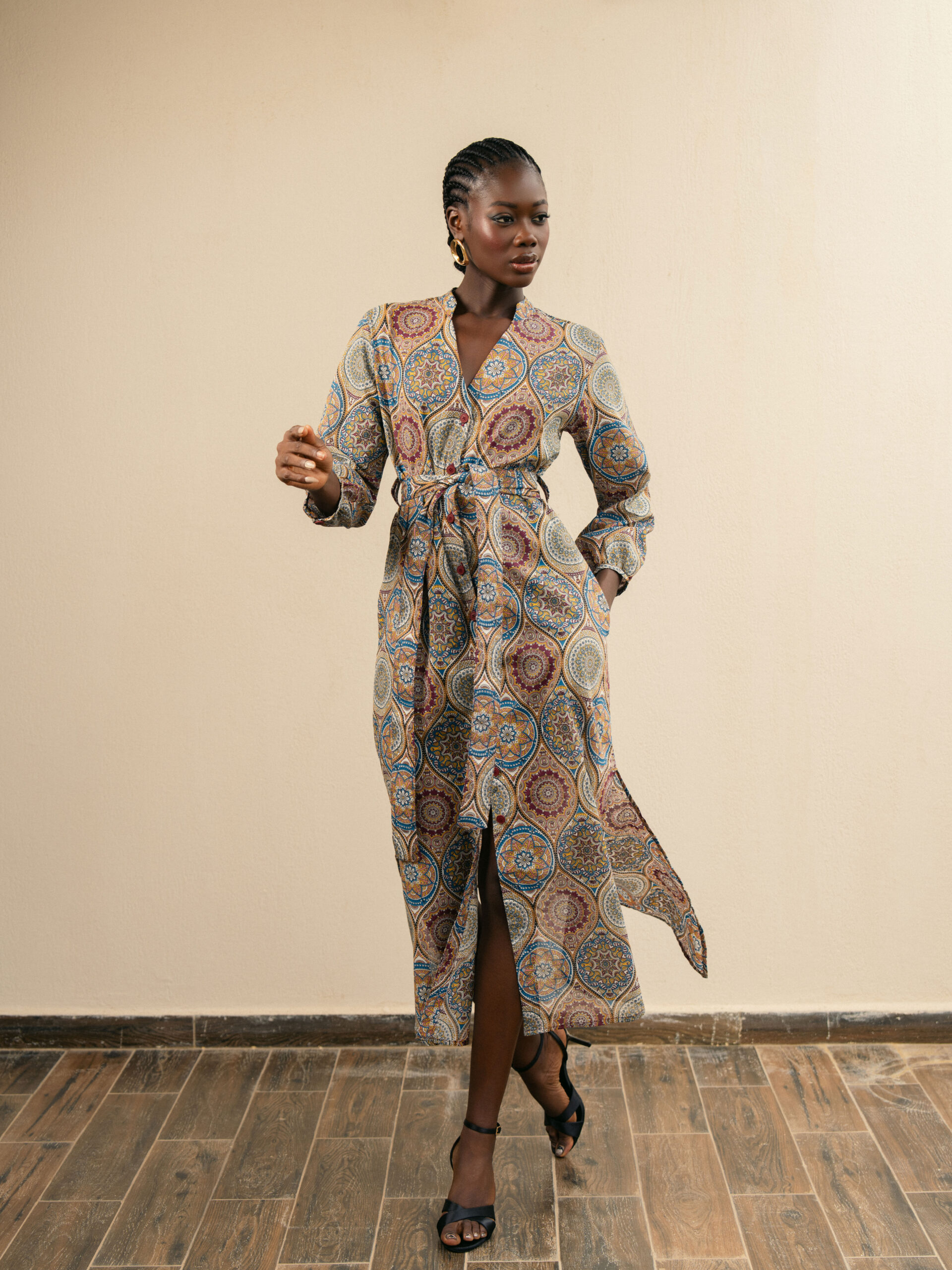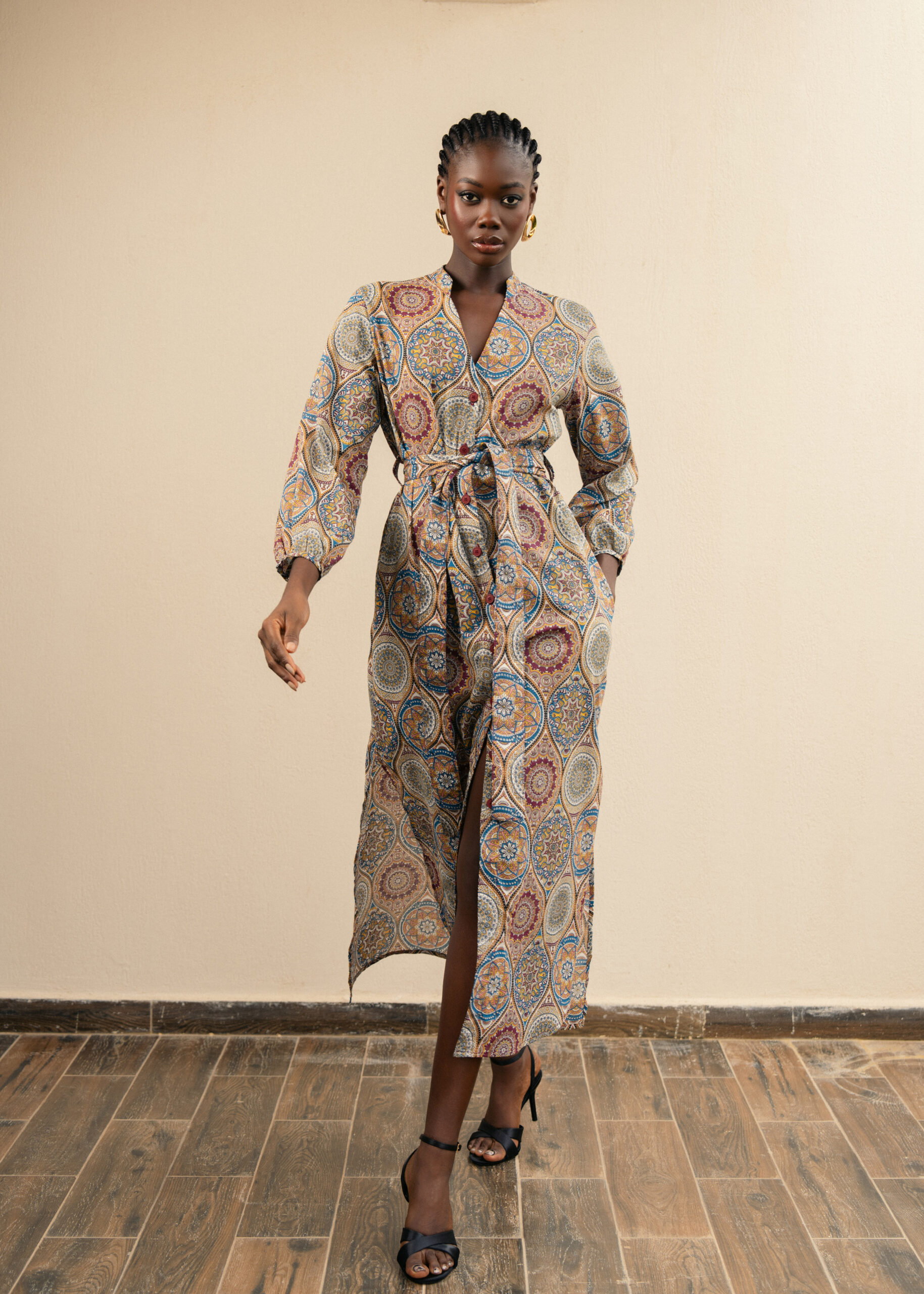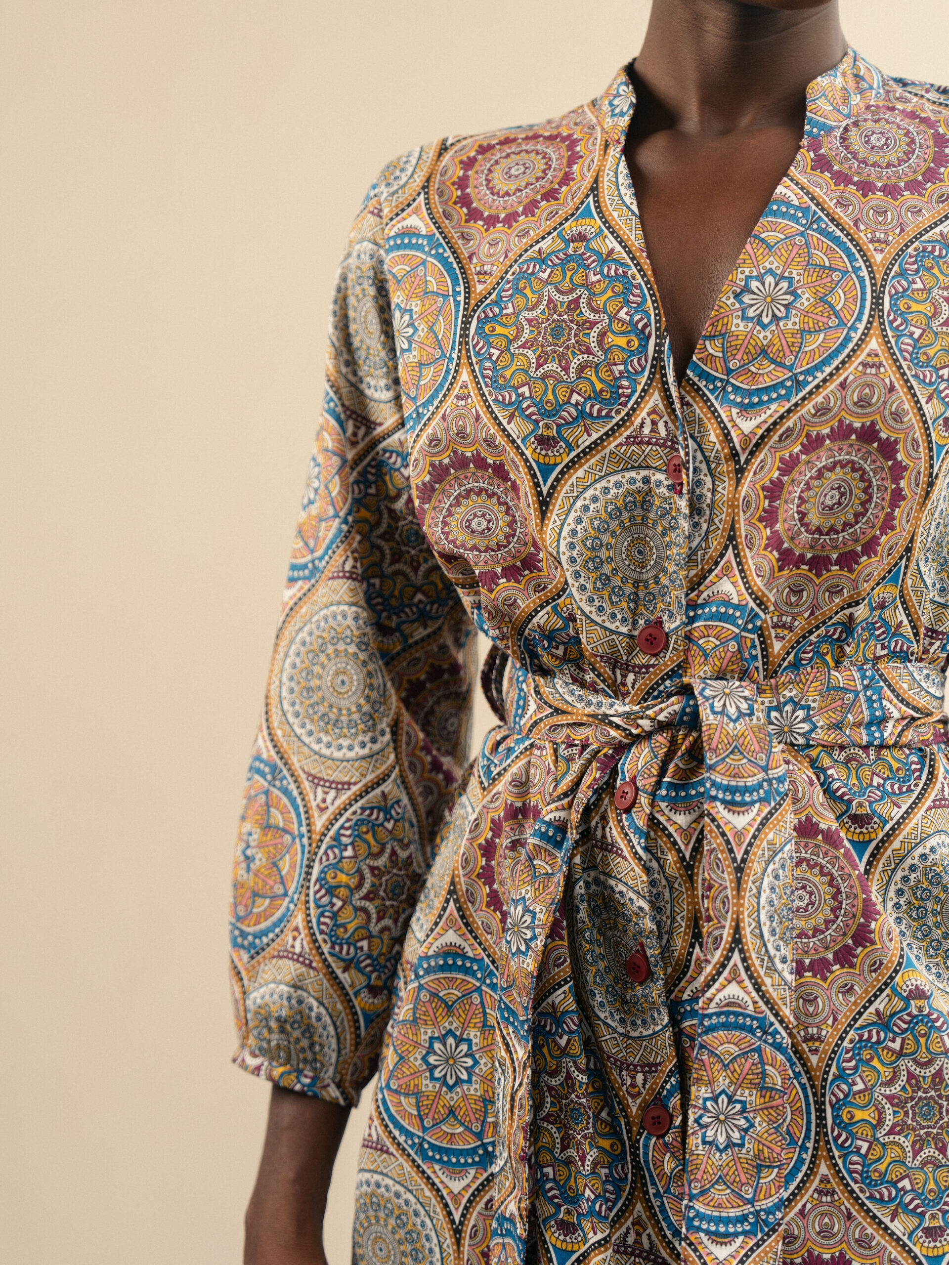 Robe chemise à manches 7/8. Encolure en V et ceinture à la taille.