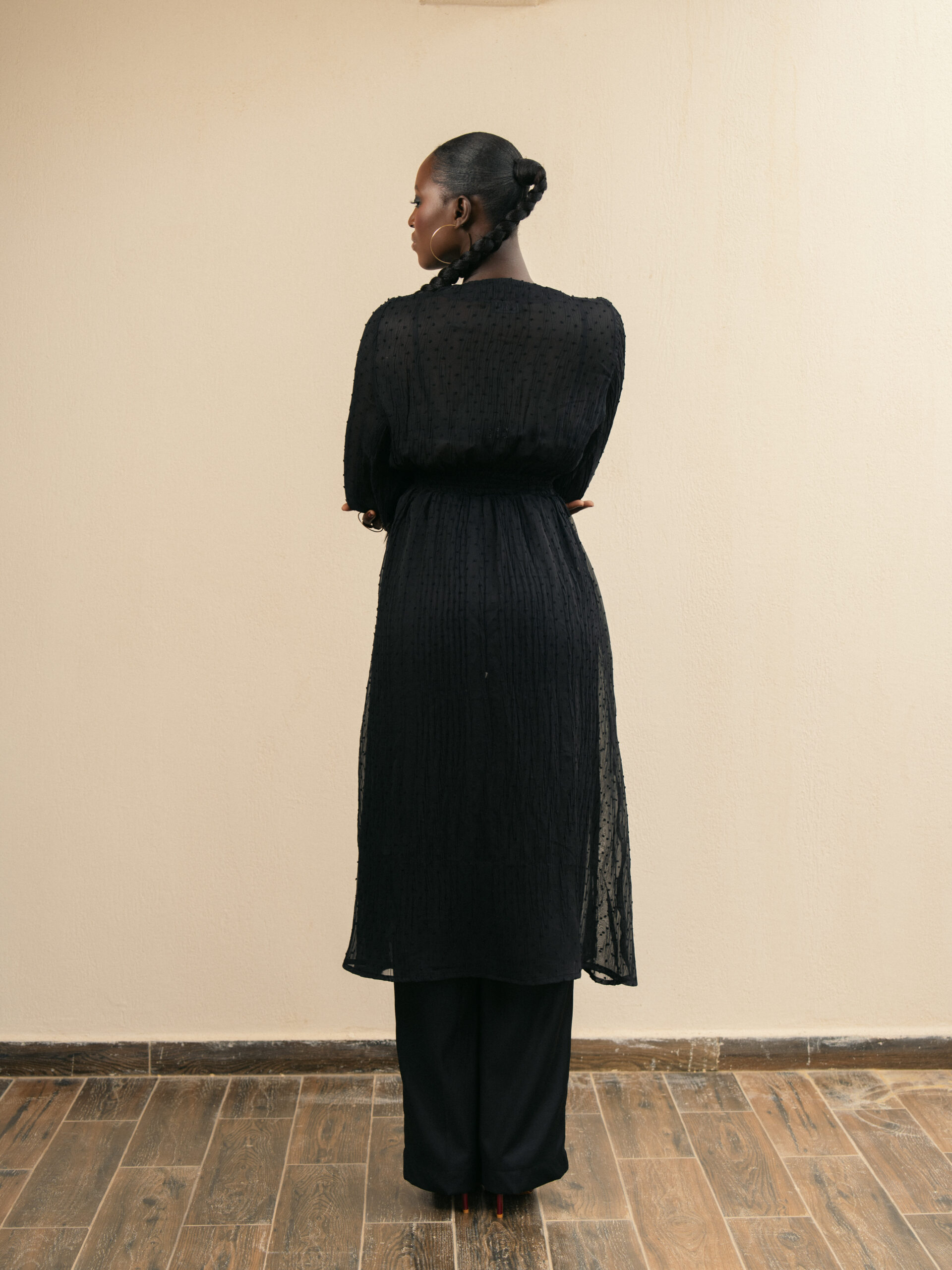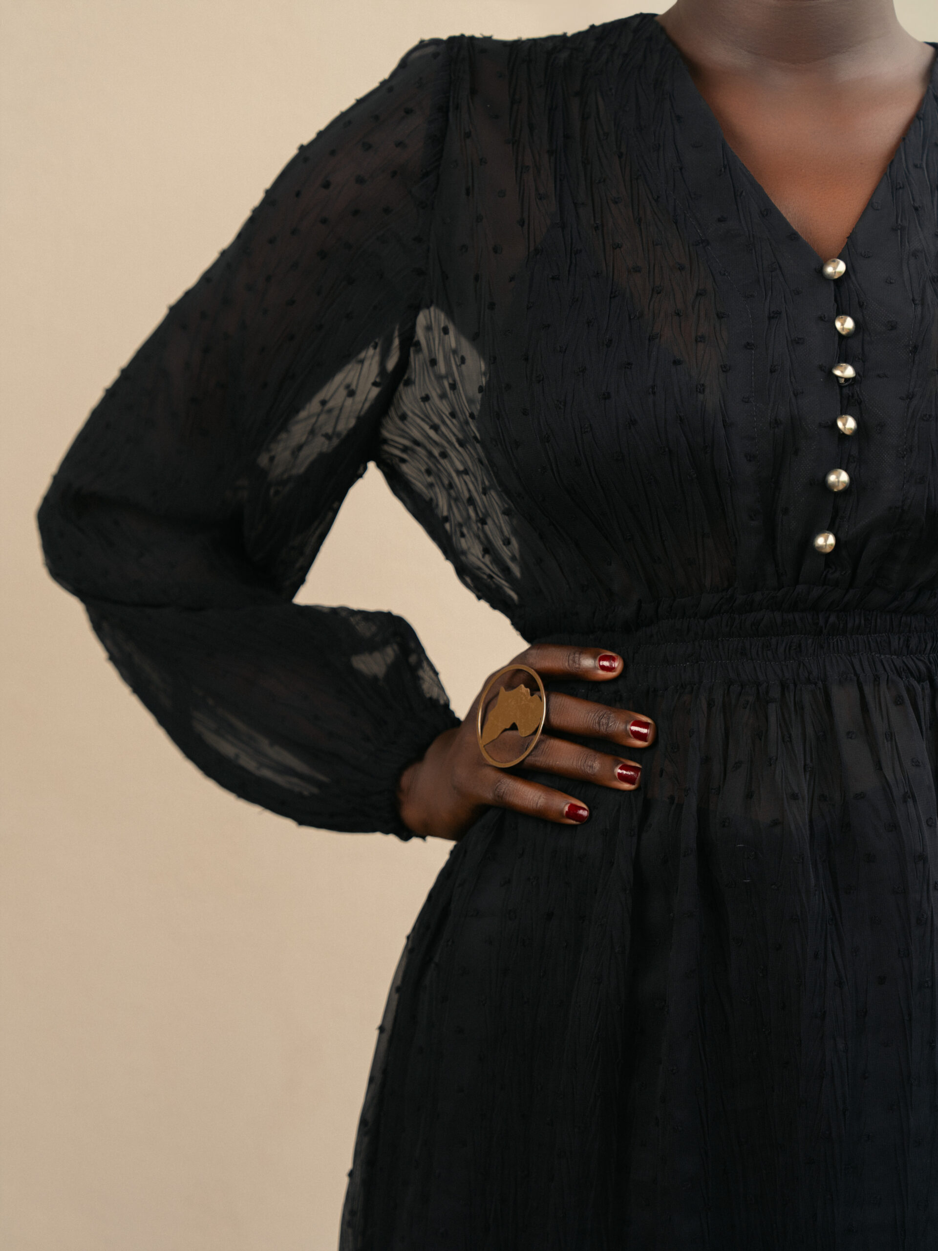 Robe en plumetis avec élastique à la taille. Encolure en V et poignets élastiques.
