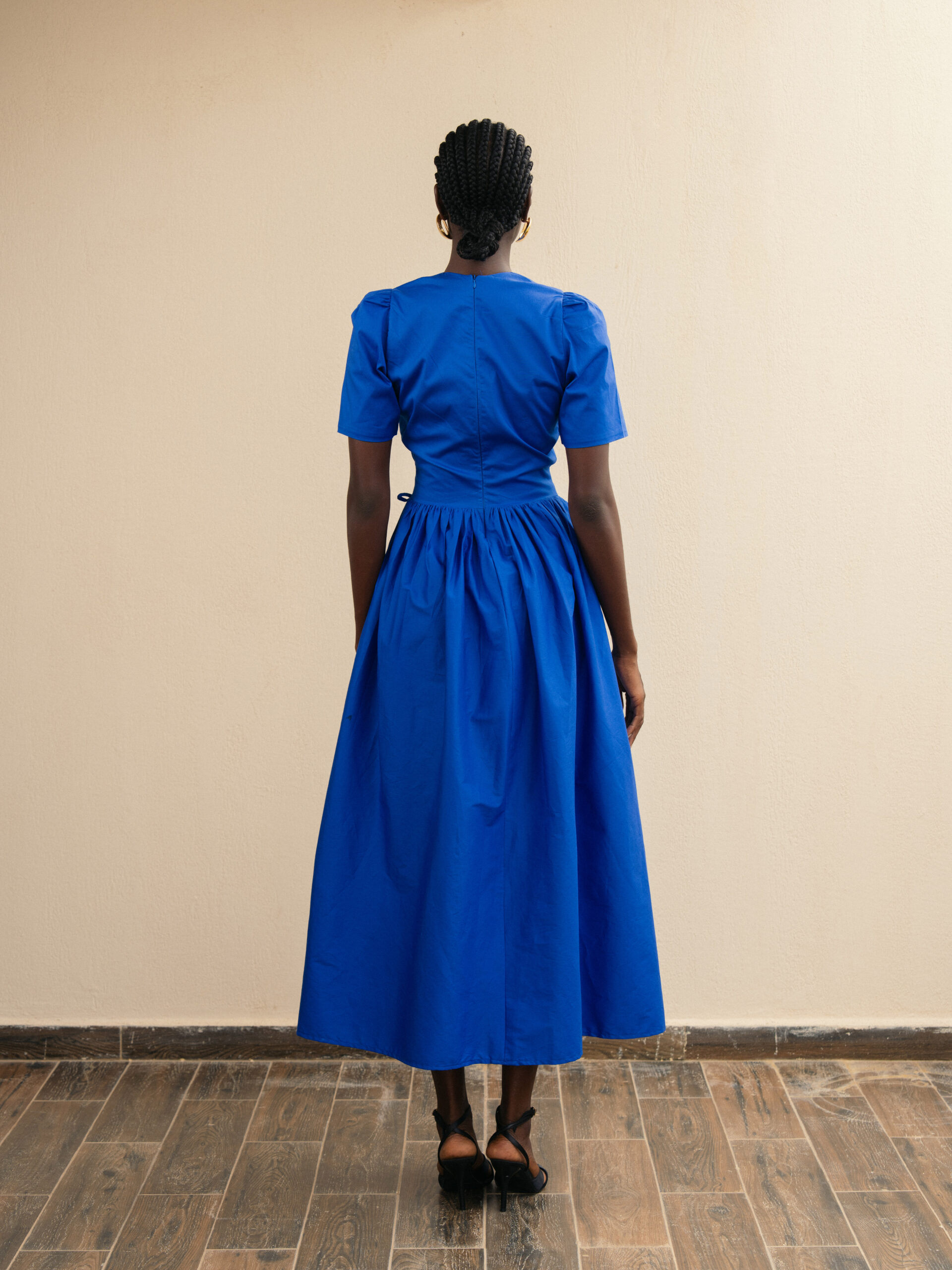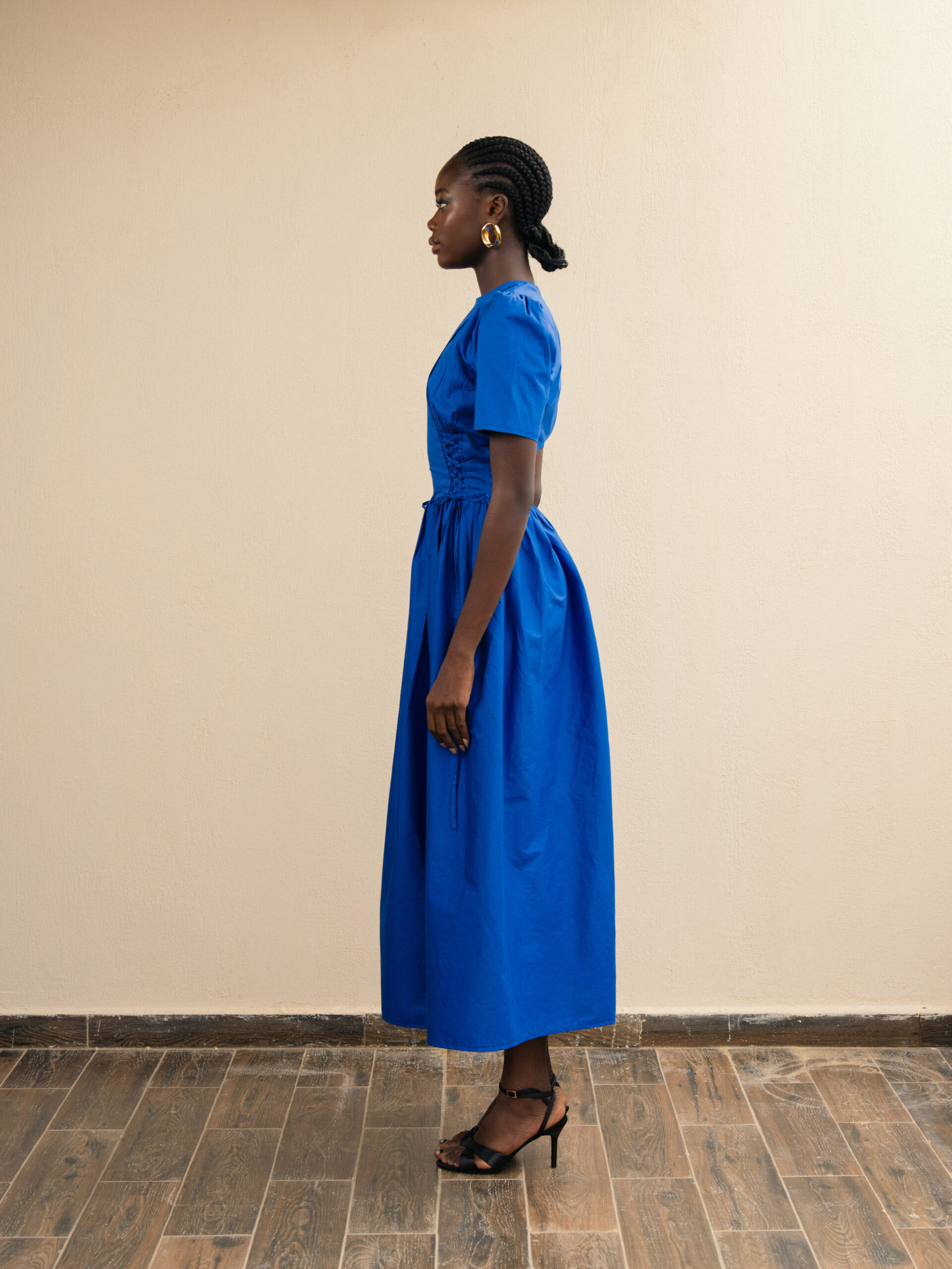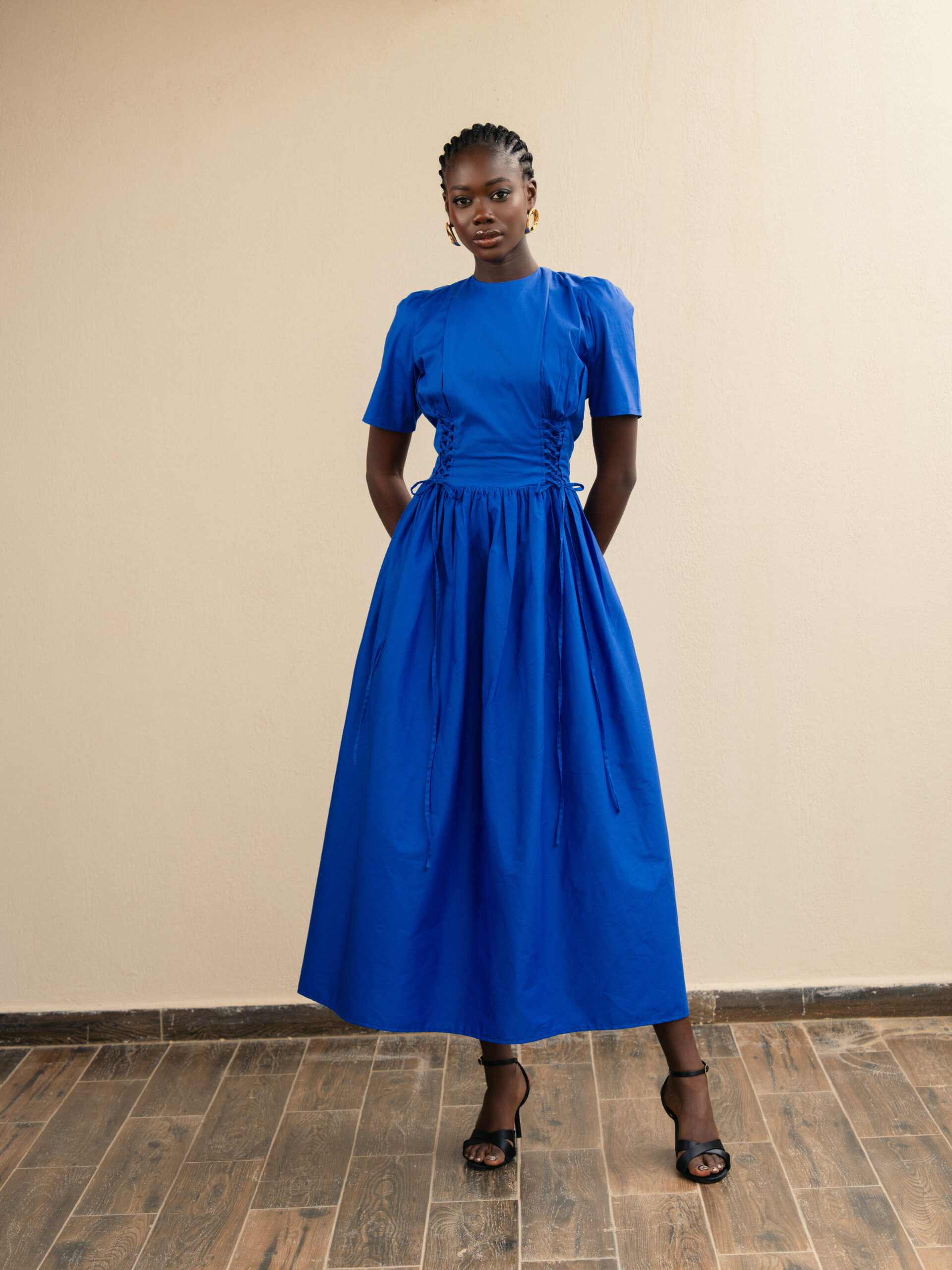 Robe en coton avec lacets sur les côtés. Col rond et fermeture au dos.