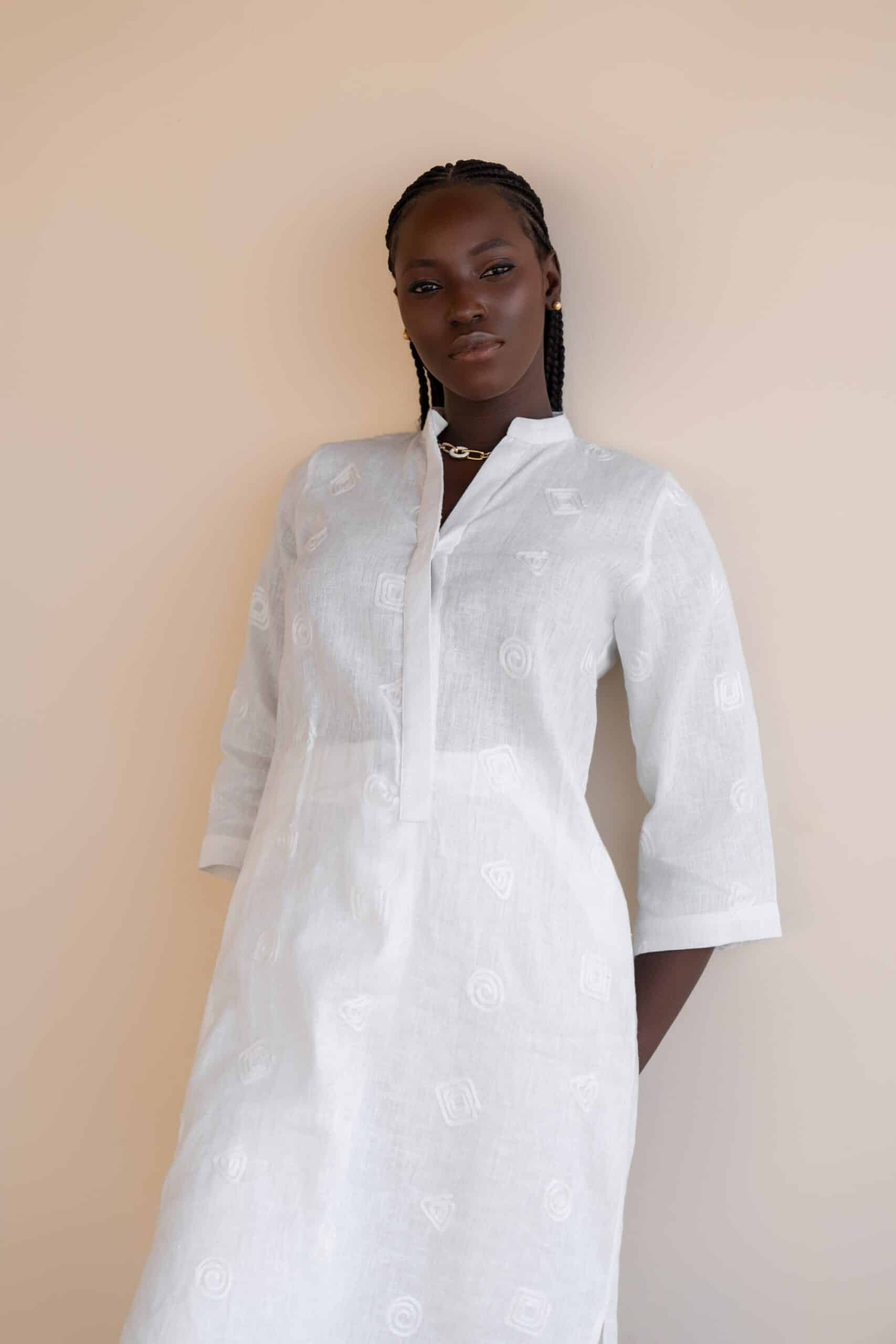 Tunique brodée en lin. Fentes sur les côtés. Encolure en V avec patte de boutonnage.