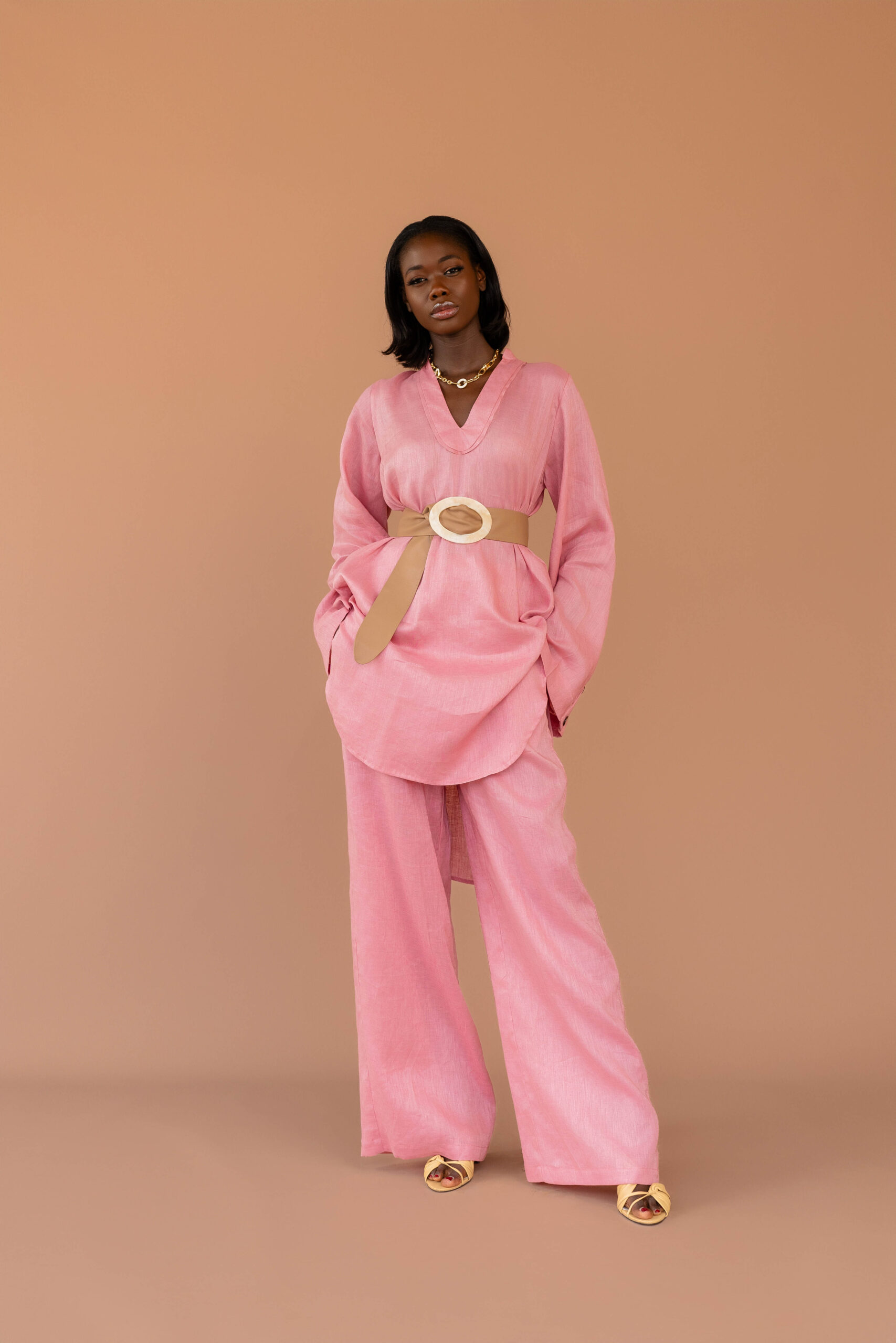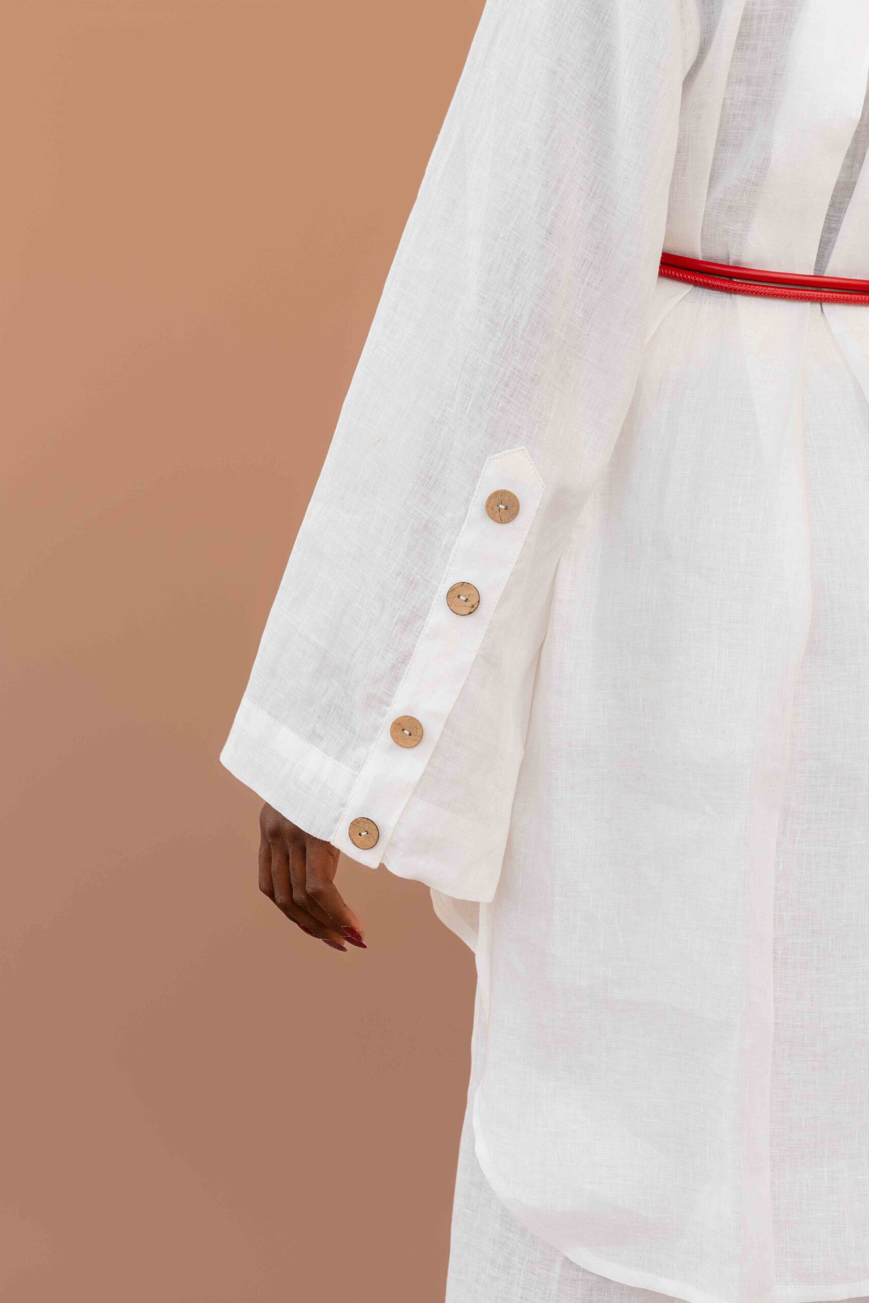 Tunique en lin à encolure en V et empiècement, découpe dans le dos et large plis creux. Manches amples avec fausses pattes de boutonnage.